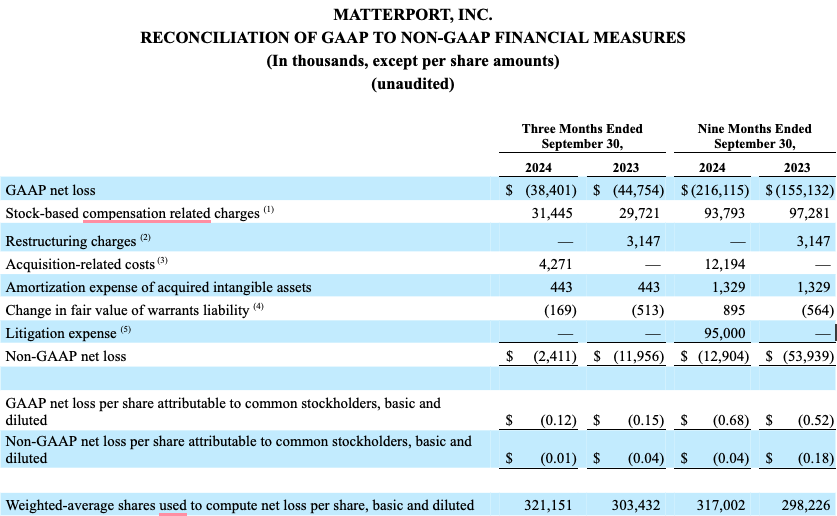 Non-GAAP Net Loss and Non-GAAP Net Loss Per Share, Basic and Diluted. Matterport defines non-GAAP net loss as net loss, adjusted to exclude stock-based compensation-related charges (including share-based payroll tax expense), fair value change of warrants liability, amortization of acquired intangible assets, litigation expense, and acquisition-related transaction costs, in order to provide investors and management with greater visibility to the underlying performance of Matterport’s recurring core business operations. We define non-GAAP net loss per share, as non-GAAP net loss divided by the weighted-average shares outstanding, which includes the dilutive effect of potentially diluted common stock equivalents outstanding during the period if any.