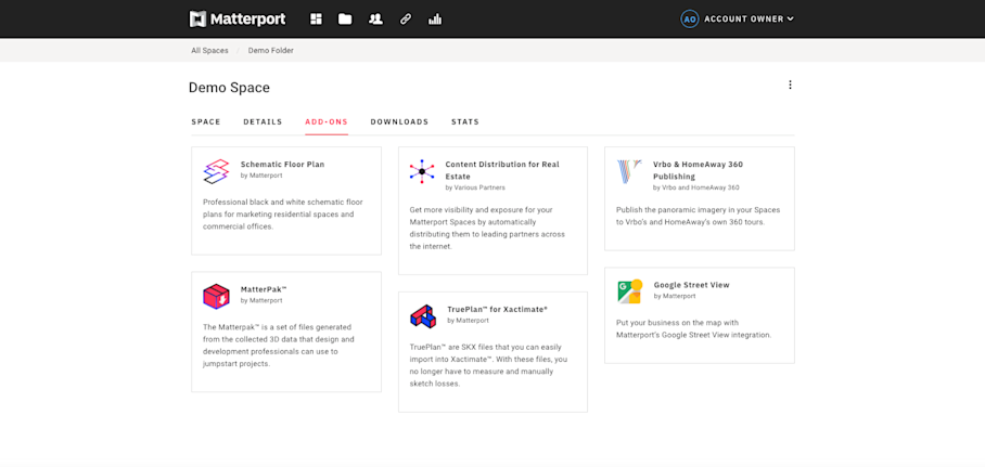 Now, anytime you log on and view a Matterport digital twin on your account, you'll be able to see your enabled Add-Ons — all in one place. In the coming months, you'll also be able to see new offerings from the Matterport team here.
